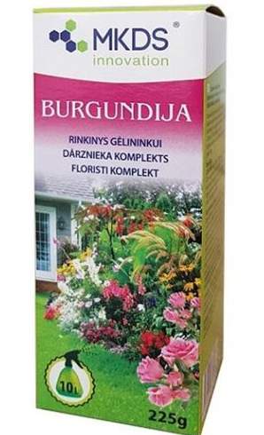 Augus ieteicams apstrādāt ar Burgundijas šķidrumu, lai novērstu šādus simptomus: hloroze (lapu, dzinumu, stublāju krāsas izmaiņas), deformācijas, baltas un pelēkas zvīņas, traipi, lapu krišana, žāvēšana, nekroze (audu vai augu daļu atmiršana, nomelnošana) utt. Dārznieka komplekts Burgundija sastāv no vara sulfāta 100g, kalcinētas sodas (nātrija karbonāta) 125g un ūdens. Visbiežāk izmantotai risinājums ir 1% koncentrācija sajaucot to proporcijā 1: 1,25: 100. Lai pagatavotu 10 litru šķīdumu ir vajadzīgi: 10 l ūdens, 100 g vara sulfāta un 125 g sodas. Lietošana: gatavojot Burgundijas šķidrumu, 5 litros ūdens izšķīdina vara sulfātu un atlikušajos 5 litros 125g sodas. Pēc tam lēnām maisot ielej sodas šķīdumu vara sulfāta šķīdumā. Burgundijas šķidrums ir visefektīvākais, ja jutīgās auga daļas ir pārklātas ar vienmērīgu aizsargkārtu. Šis maisījums ir īpaši piemērots lietošanai uz ziediem, jo nekrāso augus tik intensīvi un nebojā krāšņo izskatu. Ražots: Lietuvā