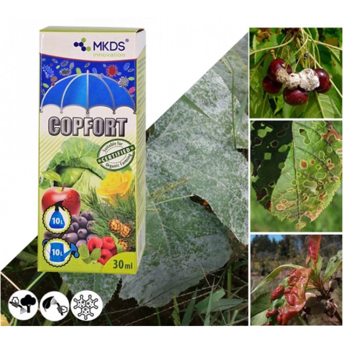COPFORT ir augu kopšanas līdzeklis, kas satur augstas kvalitātes vara glikonātu. Produkts nodrošina ātru un efektīvu vara uzsūkšanos caur augu lapām un saknēm, piedāvājot sistemātisku darbību. COPFORT ne tikai aizsargā augus no vara deficīta, bet arī stiprina to izturību pret nelabvēlīgiem vides apstākļiem, veicinot veselīgu augšanu un attīstību.
