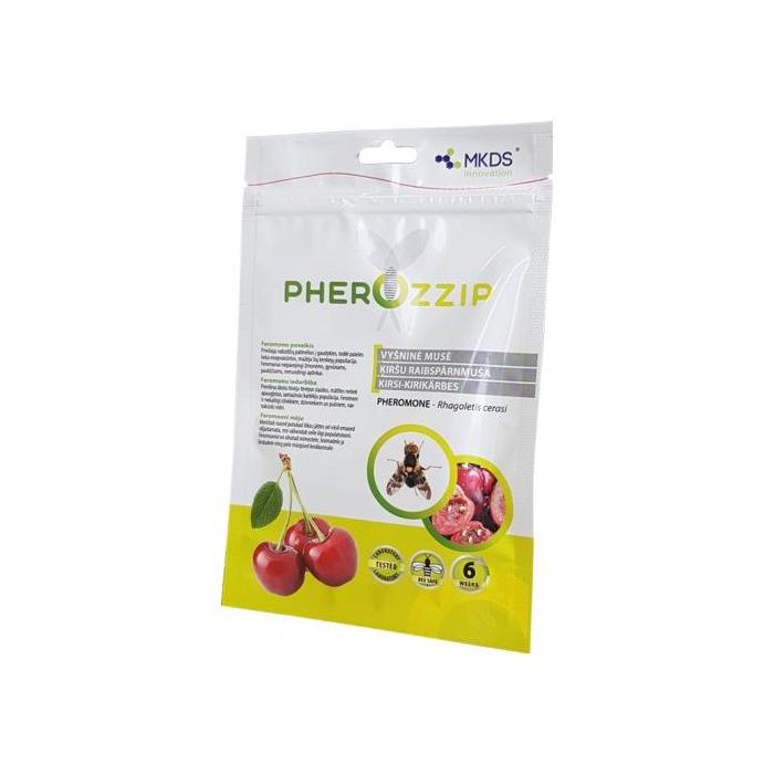 (Rhagoletis ceresi) Ķiršu raibspārnmušas pievilināšanai, noķeršanai un daudzuma noteikšanai. Feromonu iedarbība: Ievilina ķriršu raibspārnmušas tēviņus slazdos, mātītes netiek apaugļotas, samazinās kaitēkļu populācija. Feromoni ir nekaitīgi dzīvniekiem un putniem, nav toksiski videi. Kāpuri ir dzeltenīgi baltā krāsā, no iekšpuses tie izgrauž ogu mīkstumu. Bojātās ogas kļūst mīkstas , to virspusē rodas pleķi, iedobumi, vēlāk tās pūst un nokrīt. Vairāk tiekbojāti saldie ķirši. LIETOŠANA: Slazdus pakar augļu dārza vidū, R vai DR pusē, no tiešiem saules stariem pasargātā vietā. Ķērājus izkar pavasarī pirms ziedēšanas līdz ogu briešanai. Ieteicams 1 ķērājs/1 kokam. Feromonu slazda darbības ilgums ir 4-6 nedēļas, pēc tam slazda efektivitāte samazinās. Iepakojumā ir feromons-pievilinātājs, izkāršanai izmantojiet TRĪSSTŪRVEIDA ĶERŠANAS SLAZDU DELTA vai VAIRĀKKĀRT LIETOJAMO SLAZDU vai arī izgatavojiet slazdu paši.