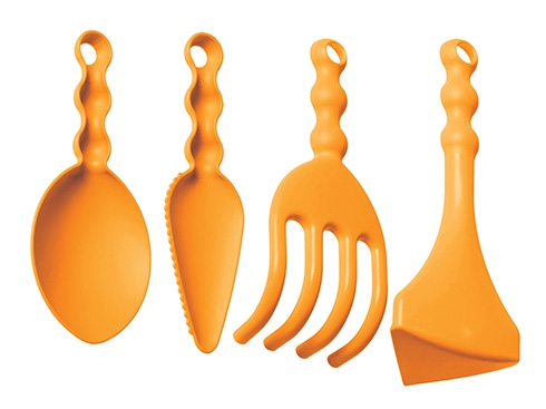 Dārza darbarīku komplekts bērniem, gaiši oranžā krāsā. Ražots Itālijā.