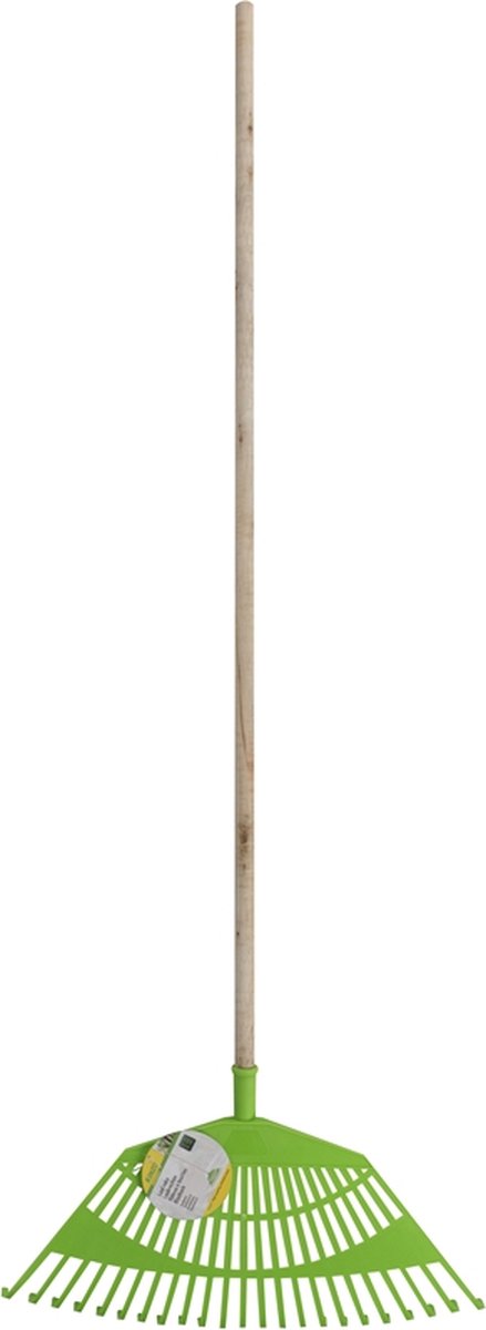 Grābeklis lapu grābšanai zaļā krāsā. Grābekļa vēdekļa platums 55 cm, koka kāta garums 145 cm.