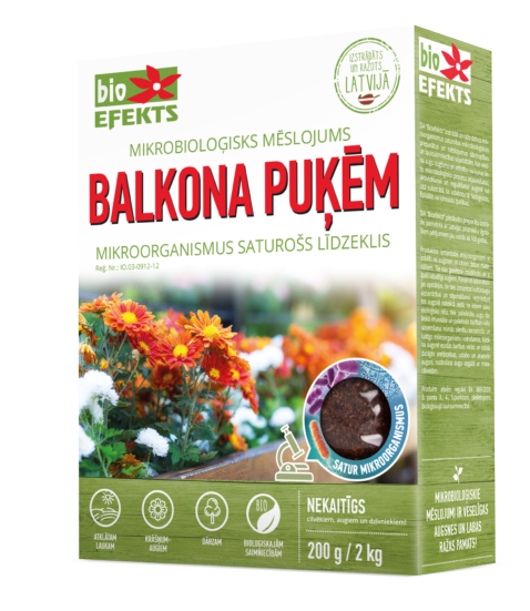 Mikroobioloģiskais preparāts balkona puķēm satur plašu spektru augsnes mikroorganismu, kas izdala citokinīnus un auksīnu, saista slāpekli no gaisa un pārveido augiem pieejamā formā. Preparāts sekmē sakņu sistēmas attīstību, paaugstina to spēju pretoties nelabvēlīgas vides stresam un palielina imunitāti, nodrošina labvēlīgas mikrofloras saglabāšanos augsnē.