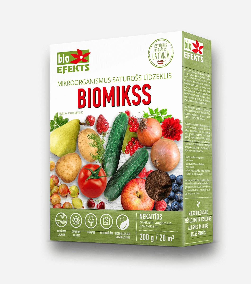 BIOMIKSS ir komplekss mikroorganismu maisījums, kas satur 7 baktēriju un 2 sēņu celmus, kuri mazina slimību izraisītāju skaitu, paātrina augu augšanu, veicina ziedēšanu un ražas nobriešanu. Azotobacter spp. saista atmosfēras slāpekli, veicina augu attīstību, nomāc daudzus patogēnus. Polyangium spp. izdala auksīnus un vitamīnus, kuri paaugstina augu imunitāti – spēju pretoties infekcijām. Streptomyces spp. izdala antibiotiskas vielas, lītiskos fermentus, heteroauksīnus un aminoskābes; ir vairāku patogēno sēņu antagonisti. Trichoderma spp. ir daudzu patogēno sēņu antagonisti.