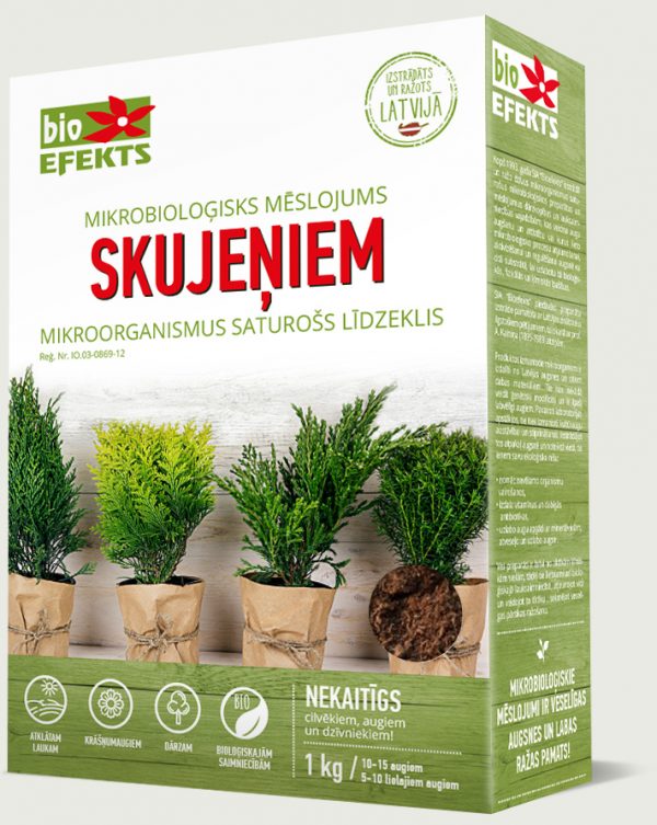 Mikrobioloģiskais mēslojums skujeņiem satur īpaši izvēlētus augsnes mikroorganismus. Tie atveseļo augsni, veicina sakņu sistēmas attīstību un minerālo elementu uzņemšanu. Mēslojums skujeņiem uzlabo auga izskatu un zaļo masu, samazina atsevišķu augu "izkrišanu" un dzeltēšanu. Ievērojami nostiprina augu rezistenci pret nelabvēlīgiem vides apstākļiem un kaitīgajiem organismiem. Uzlabo ziemcietību.