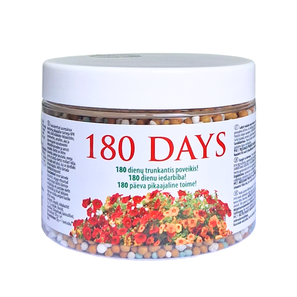 180 DAYS ir īpašas tehnoloģijas mēslojums, tā sauktā kontrolētā izdalīšanās. Nodrošina vislabākos apstākļus iekštelpu, balkona, āra puķu, dekoratīvo augu augšanai, kā arī rožu un košumkrūmu bagātīgai ziedēšanai. Uzturvielas tiek ievietotas granulās ar īpašu polimēru pārklājumu. Šis pārklājums temperatūras un mitruma ietekmē pakāpeniski sadalās un nepārtraukti, bet nelielos daudzumos, izdala augsnē barības vielas. Tas nodrošina adekvātu augu barošanu visā augšanas sezonā – no agra pavasara līdz vēlam rudenim – 180 dienas gadā. Šis mēslojums ir īpaši vērtīgs situācijās, kad ir grūti nodrošināt intensīvu augu kopšanu - kapos, uz balkoniem u.c.
