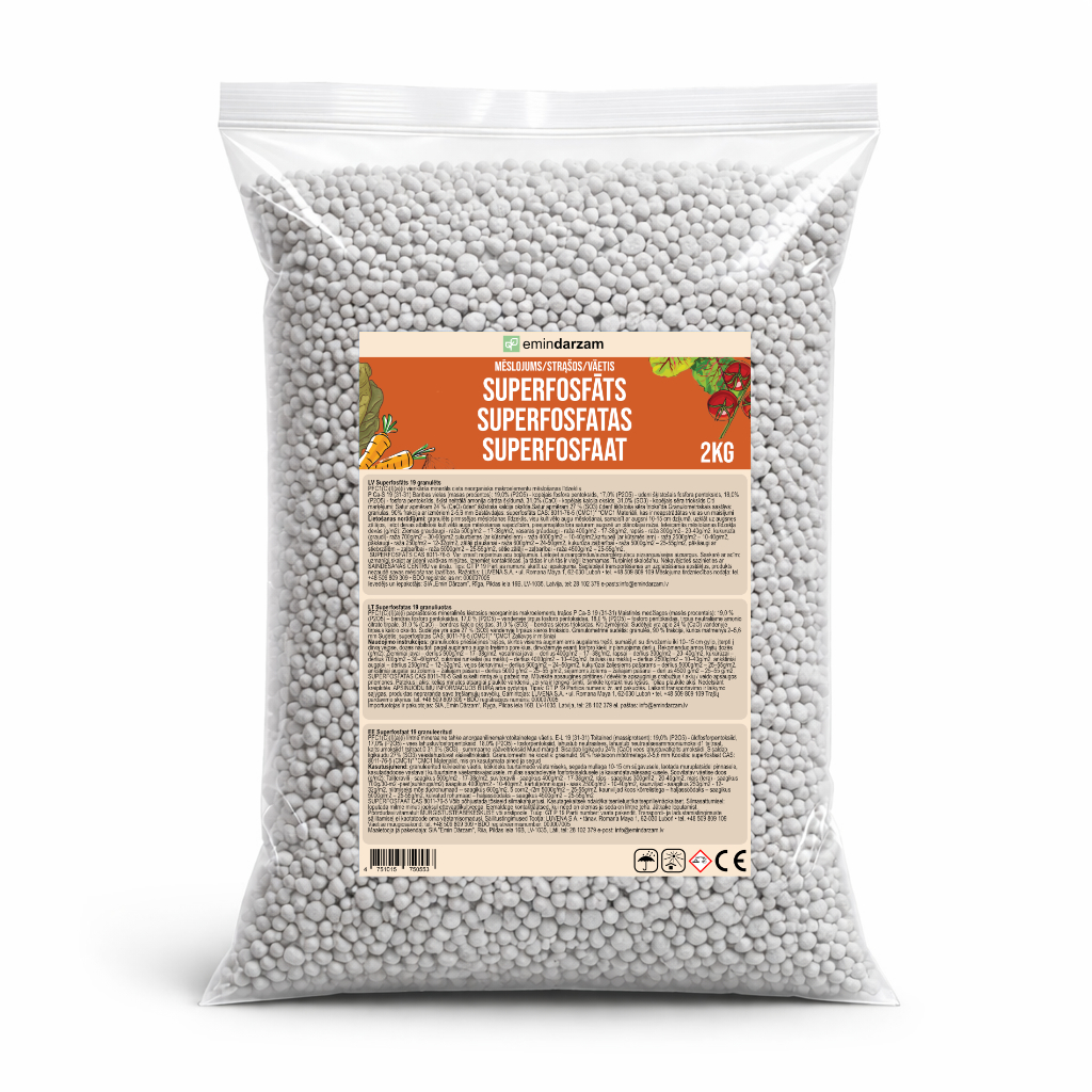 Granulēts superfosfāts ir efektīvs pirmssējas mēslojums, kas nodrošina augus ar viegli uzņemamu fosforu un veicina spēcīgas sakņu sistēmas attīstību jau augšanas sākumā. Tas palīdz augiem labāk iesakņoties, uzlabo barības vielu uzņemšanu un veicina vienmērīgu attīstību visā veģetācijas periodā. Papildus esošais kalcijs stiprina augu audus, savukārt sērs sekmē pilnvērtīgu augšanu un veselīgu lapojumu. Īpaši piemērots augsnēm ar zemu fosfora nodrošinājumu un kultūrām, kurām svarīgs spēcīgs starta efekts.