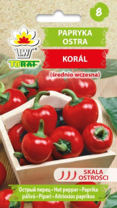 KORÁL asie pipari. Vidēji agra aso piparu šķirne ar intensīvi sarkaniem, maziem 2-3 cm apaļiem augļiem, ko parasti sauc par ķiršu pipariem. Lieliski piemērots konservēšanai, pildīšanai, salsas pagatavošanai un žāvēšanai. Tos var audzēt arī podos uz balkoniem un terasēm. Sēšana dēstu kastītēs martā, stādu pārstādīšana zemē vai podos jūnija vidū.