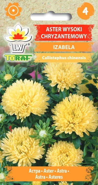 Krizantēmu asteres Izabela ( C. chinensis fl.pl.) Krizantēmu asteres koši dzeltenā krāsā ar intensīvāki dzeltenu vidiņu. 50-80cm augsti krūmi. Sēj III-IV dēstu kastītēs vai atklātā laukā V .Sadīgst 7-9 dienās. Izstāda pēc salnām saulainā, barības vielām bagātā augsnē. Audzēšanas attālums 20x40cm.Izmanto apstādījumos un griezto ziedu ieguvei. Zied no jūlija līdz rudens salnām