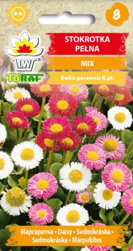 (Bellis perennis) Daudzgadīgas. Ļoti dekoratīvs, daudzgadīgs augs ar balti-sarkaniem pildītiem pomponu tipa pildītiem ziediem. Augstums 15-20cm. Sēj VI-VII, izstāda septembrī. Sadīgst 10-15 dienās. Zied nākamā gadā IV-VII. Audzē saulainā vai nedaudz noēnotā vietā, auglīgā augsnē. Piemērotas akmens dārziem, dobēm. Viegli audzējamas. Mazprasīgas.