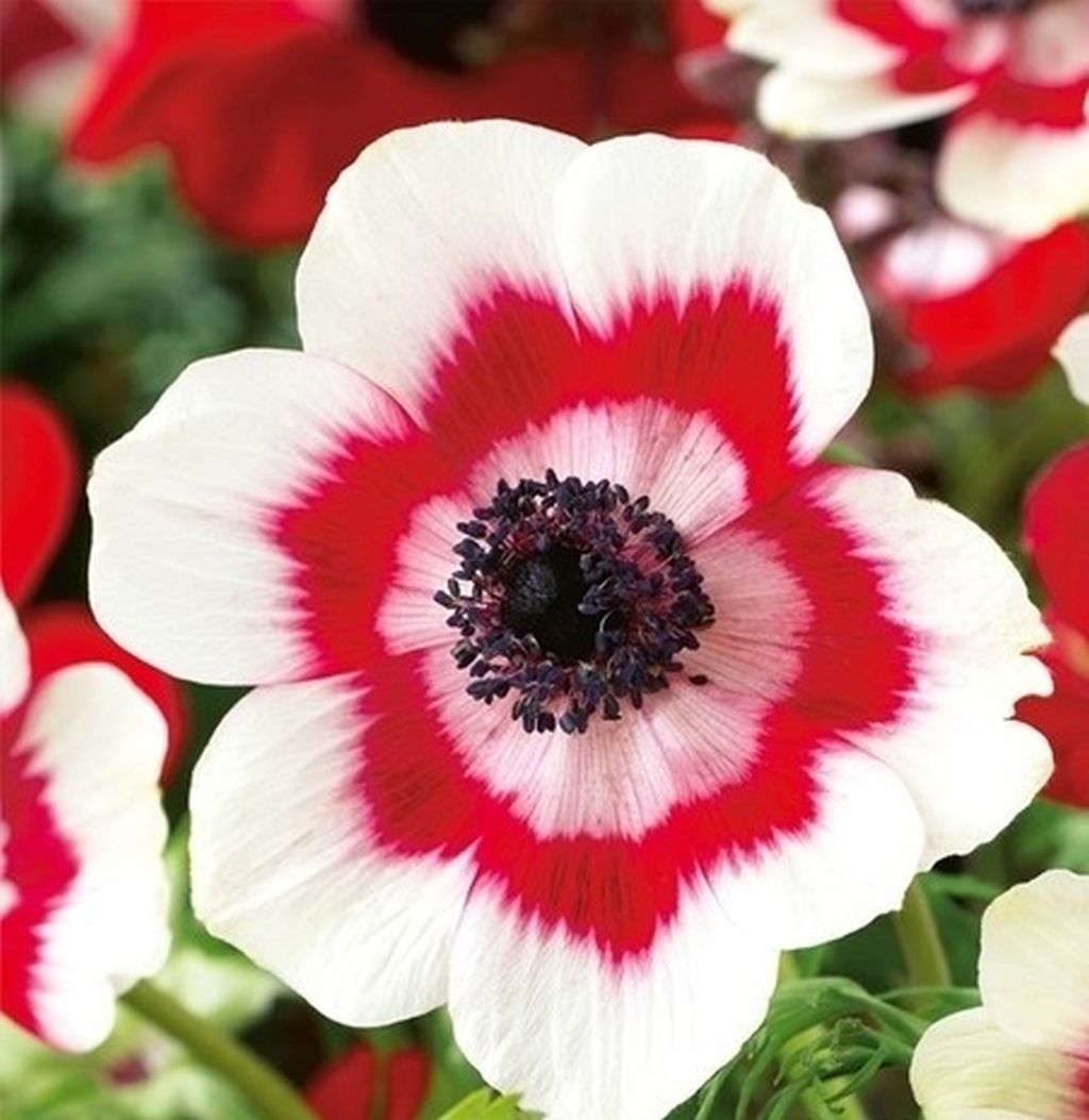 Anemones Bicolor. Divkrāsu ziedi. Stāda no aprīļa līdz maijam, 8-10 cm dziļumā. Ziedēšanas periods no jūlija līdz augusta