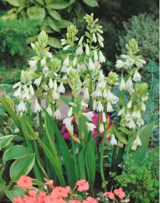 Vasaras hiacintes, galtonijas. (Galtonia candicans) 100-120cm augstas, zied VII-VIII. Sīpolaugs. Savvaļā aug Dienvidāfrikā, Kapzemē. Ziedi balti, sakārtoti baltos, skrajos ķekaros. Audzēšanai piem;erotas saulainas vietas. Baidās no pārmērīga augsnes mitruma. Stāda irdenā, vidēji mitrā augsnē, Vasarā regulāri jālaista. Sīpolus, tāpat kā gladiolas pārziemina tumšās, vēsās telpās. Maigās ziemās pietiek ar piesegšanu ar egļu zariem.