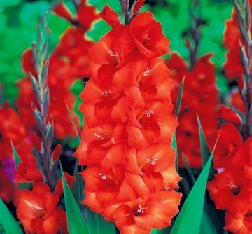 Gladiolas apelsīnkrāsas ziediem, 100-120cm augstas. Gladiolas iesaka stādīt IV beigās, V sākumā, kad augsne ir iesilusi līdz +9oC. Neiesaka pārak agri stādīt gladiolu bumbuļsīpolus, jo aukstā augsnē iestadītu bumbuļsīpolu attīstība aizkavējas. Siltā laikā pat 2 nedēļas vēlāk iestādītas gladiolas uzdīgst ātrāk un attīstība notiek straujāk. Vēlajiem stādījumiem svarīgs ir augsnes nodrošinājums ar mitrumu. Ja mitruma pietiek līdz gladiolai izveidojas 3. lapa,tas ir, laikā kad sāk veidoties 2.pakāpes saknes, tad sausums vairs sekas neradīs. Gladiolas stādīt vajadzētu ziemeļu-dienvidu virzienā orientētās vienrindu vai divrindu slejās,kas izvietotas 70 cm viena no otras. Atklātā, valdošiem vējiem pakļautā laukā gladiolas, lai tās ziedēšanas laikā neizgāstos, jāstada padziļināti- 15 cm un dziļāk (atkarībā no augsnes struktūras)