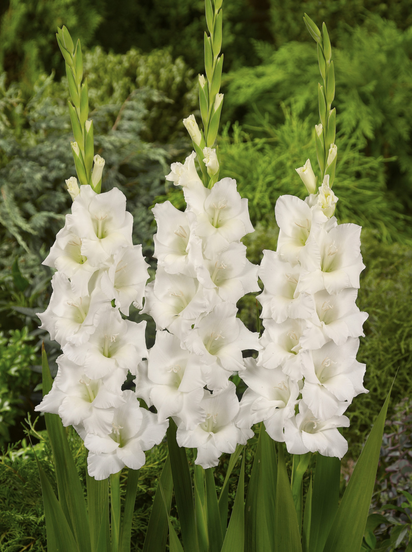 Gladiolas sniegbaltiem ziediem, 100-120cm augstas. Gladiolas iesaka stādīt IV beigās, V sākumā, kad augsne ir iesilusi līdz +9oC. Neiesaka pārak agri stādīt gladiolu bumbuļsīpolus, jo aukstā augsnē iestadītu bumbuļsīpolu attīstība aizkavējas. Siltā laikā pat 2 nedēļas vēlāk iestādītas gladiolas uzdīgst ātrāk un attīstība notiek straujāk. Vēlajiem stādījumiem svarīgs ir augsnes nodrošinājums ar mitrumu. Ja mitruma pietiek līdz gladiolai izveidojas 3. lapa,tas ir, laikā kad sāk veidoties 2.pakāpes saknes, tad sausums vairs sekas neradīs. Gladiolas stādīt vajadzētu ziemeļu-dienvidu virzienā orientētās vienrindu vai divrindu slejās,kas izvietotas 70 cm viena no otras. Atklātā, valdošiem vējiem pakļautā laukā gladiolas, lai tās ziedēšanas laikā neizgāstos, jāstada padziļināti- 15 cm un dziļāk (atkarībā no augsnes struktūras)