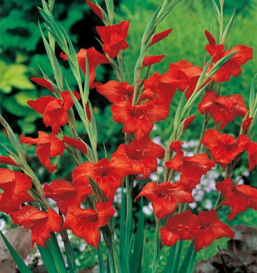 Gladiolas 50-60cm augstas koši sarkanā krāsā. Gladiolas iesaka stādīt IV beigās, V sākumā, kad augsne ir iesilusi līdz +9oC. Neiesaka pārak agri stādīt gladiolu bumbuļsīpolus, jo aukstā augsnē iestadītu bumbuļsīpolu attīstība aizkavējas. Siltā laikā pat 2 nedēļas vēlāk iestādītas gladiolas uzdīgst ātrāk un attīstība notiek straujāk. Vēlajiem stādījumiem svarīgs ir augsnes nodrošinājums ar mitrumu. Ja mitruma pietiek līdz gladiolai izveidojas 3. lapa,tas ir, laikā kad sāk veidoties 2.pakāpes saknes, tad sausums vairs sekas neradīs. Gladiolas stādīt vajadzētu ziemeļu-dienvidu virzienā orientētās vienrindu vai divrindu slejās,kas izvietotas 70 cm viena no otras. Atklātā, valdošiem vējiem pakļautā laukā gladiolas, lai tās ziedēšanas laikā neizgāstos, jāstada padziļināti- 15 cm un dziļāk (atkarībā no augsnes struktūras)