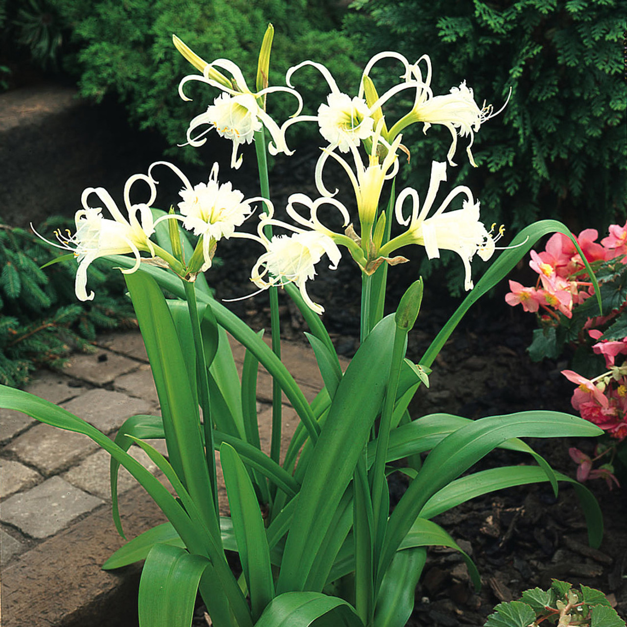 Ismenes jeb zirnekļlilijas (Hymenocallis calathina jeb Ismene calathina)Augstums 60-70cm, stādīšanas attālums 25cm, ziedēs no jūlija līdz septembrim.