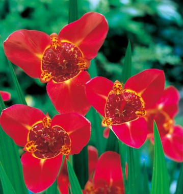 Tīģerpuķes (Tigridia pavonia) atgādina orhidejas. Līdz 70cm augstās puķes ik dienu pārsteigs ar krāšņiem, skaisti veidotiem ziediem neaizmirstamās, burvīgās krāsās. Uz katra kāta 6-8 ziedi. Katrs zieds zied tikai vienu dienu, taču katru dienu atveras pa 6-8 jauniem ziediem. Audzēšanai piemērota saulainas vietas, trūdvielām bagātas augsnes. Puķu audzēšana un uzglabāšana ziemas periodā līdzīgi kā gladiolām un acidantērām.